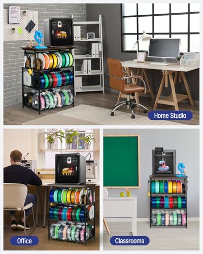 - 【Heavy-Duty Construction】 This heavy-duty 3D printer filament storage rack features a 1.5mm powder-coated metal frame that resists rust in humid workshops. The textured wood desktop absorbs vibrations for flawless first-layer adhesion. Each tier of this rack supports up to 100 lbs, ensuring your printer accessories stay organized and secure, preventing tipping or bending.