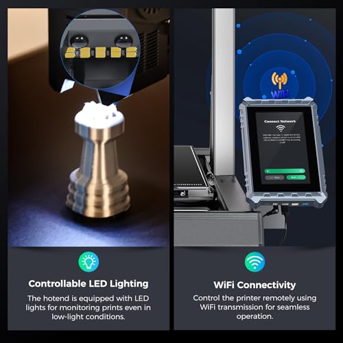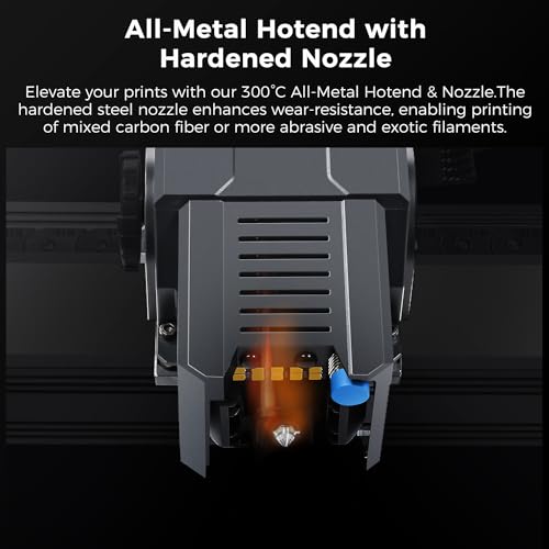 - 300℃ High Temp Printing, Compatible for More Materials – All-metal hotend equips hardened nozzle, which enhances wear-resistance, enabling printing of mixed carbon fiber or more abrasive and exotic filaments. The hotend can be heated to 300℃, which enables the printer compatible with more kinds of filaments, like TPU, PETG-CF, PLA, PETG, Carbon Fiber and Wood. Direct drive extruder provides consistent extrusion and precise retraction. 6.5:1 gear ratio, 50N pulling strength ensures smooth extrusion